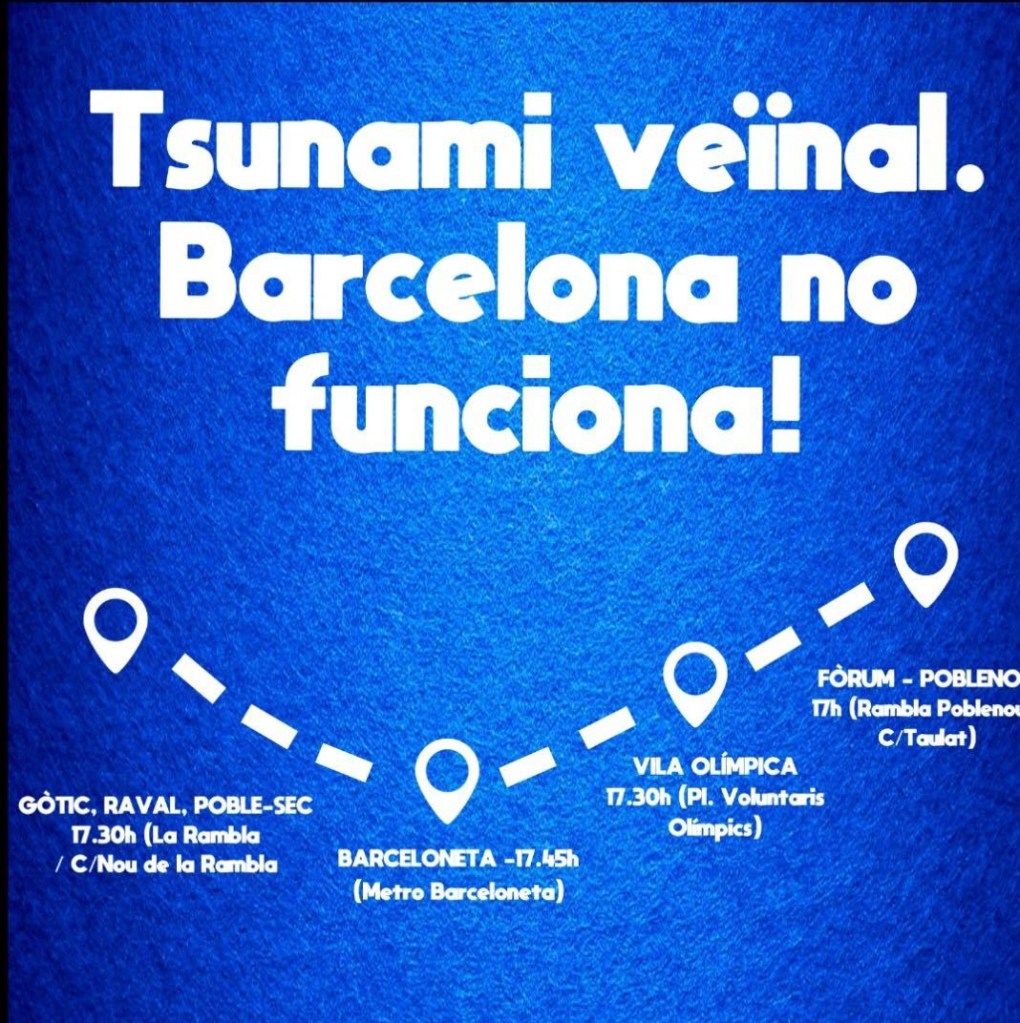 Veient la decadent tendència de la nostre estimada ciutat de Barcelona en aspectes tant bàsics de la convivència com són el civisme i la seguretat que a l’agost de 2018 diverses entitats van confirmar la plataforma reivindicativa TSUNAMI VEÏNAL.