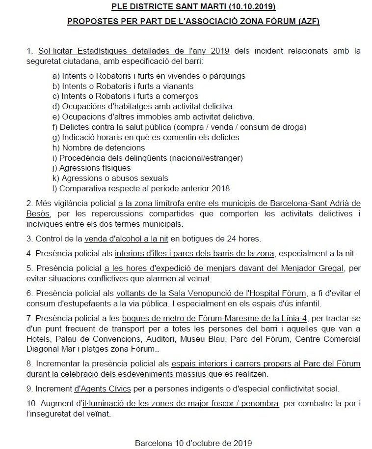 Després de que el dissabte 5 d’octubre de 2019, més de 3.000 veïns i veïnes sortissin en manifestació en demanda “d’un barri digne”, expressant el seu malestar i la manca de solucions als problemes que estan patint, en el primer Consell de Districte (10/10/2019) es va rebutjar una proposició presentada pel GMDCs en la que es demanava: