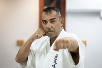 Javier Lozano (51) comienza la clase con “Oss”, saludo que simboliza respeto, en el dojo de Diagonal Mar. Allí entrenan personas diversas, incluida su familia, enfocándose en los valores y la disciplina japonesa. Los trofeos reflejan la dedicación del alumnado. Tras perder su piso en la crisis, fundó el dojo, priorizando el respeto, la colaboración y el rendimiento escolar.