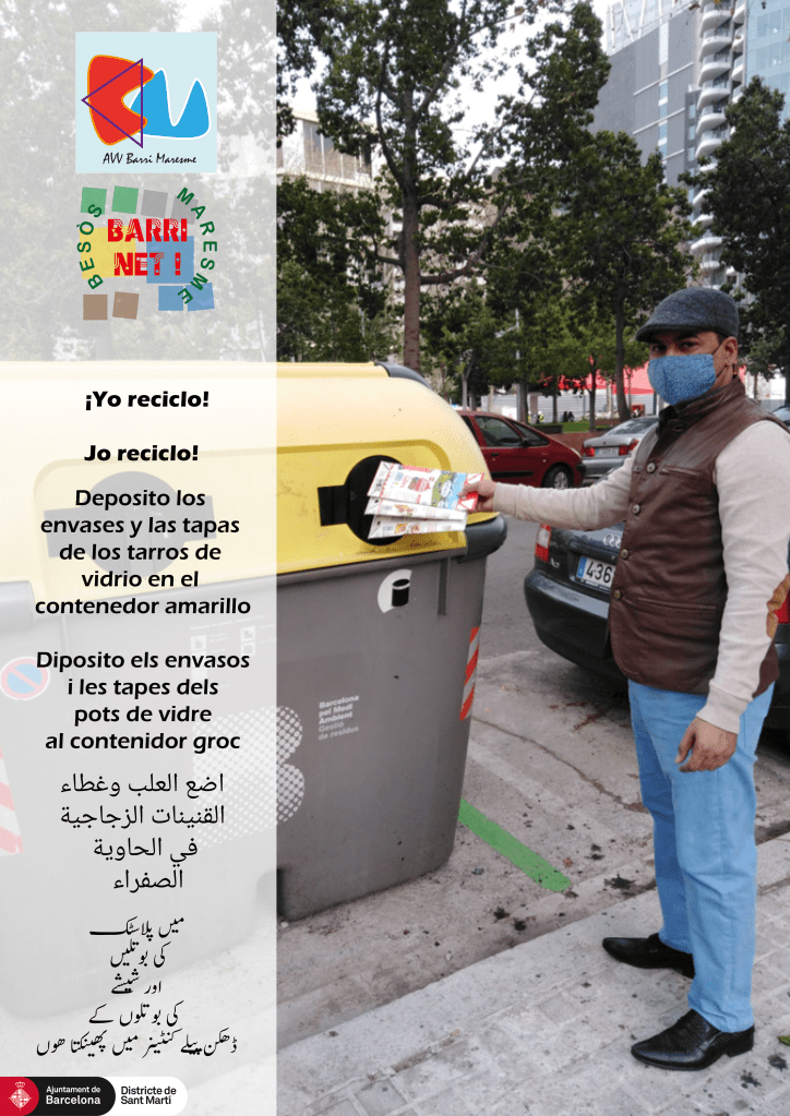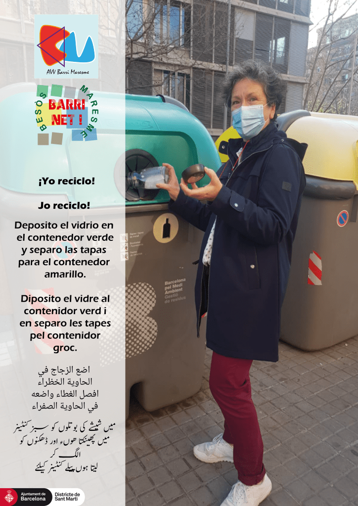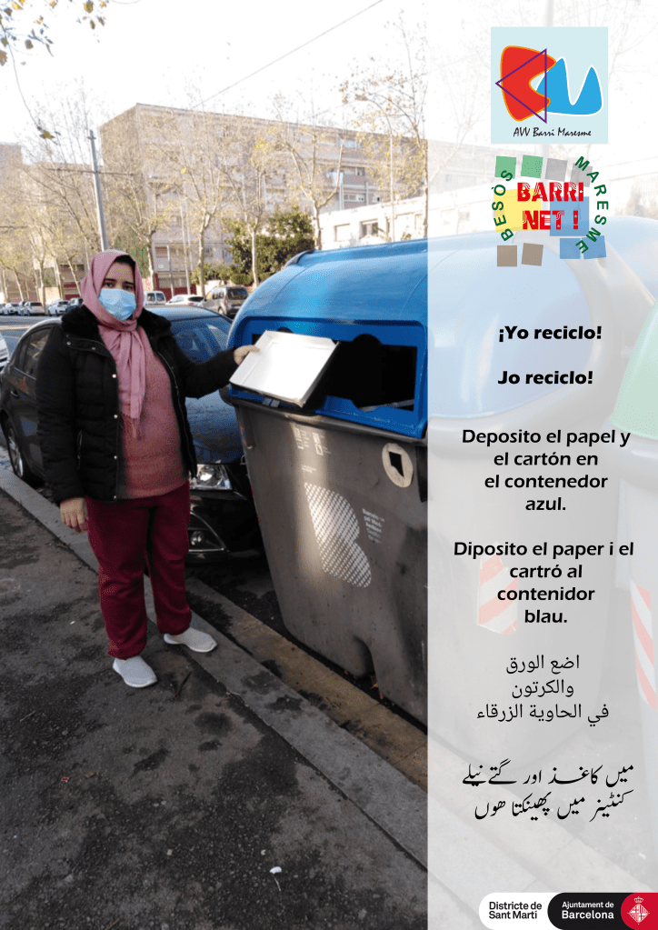 La Joana, en Mubashar i la Hanan (veïnes i veí de barri) han prestat la seva imatge per explicar que hi hem de dipositar a cada un d’aquests contenidors.
