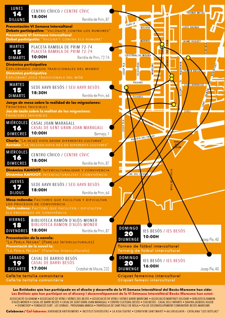 Durant la setmana es portaran a terme diverses activitats que, des d’una perspectiva intercultural, volen fomentar el desenvolupament d’accions comunitàries al barri. Es tractaran temes tan importants com els rumors, la migració, la vellesa, la convivència i la comunitat, a través de xerrades, tertúlies, dinàmiques, taules rodones i també de l’esport.